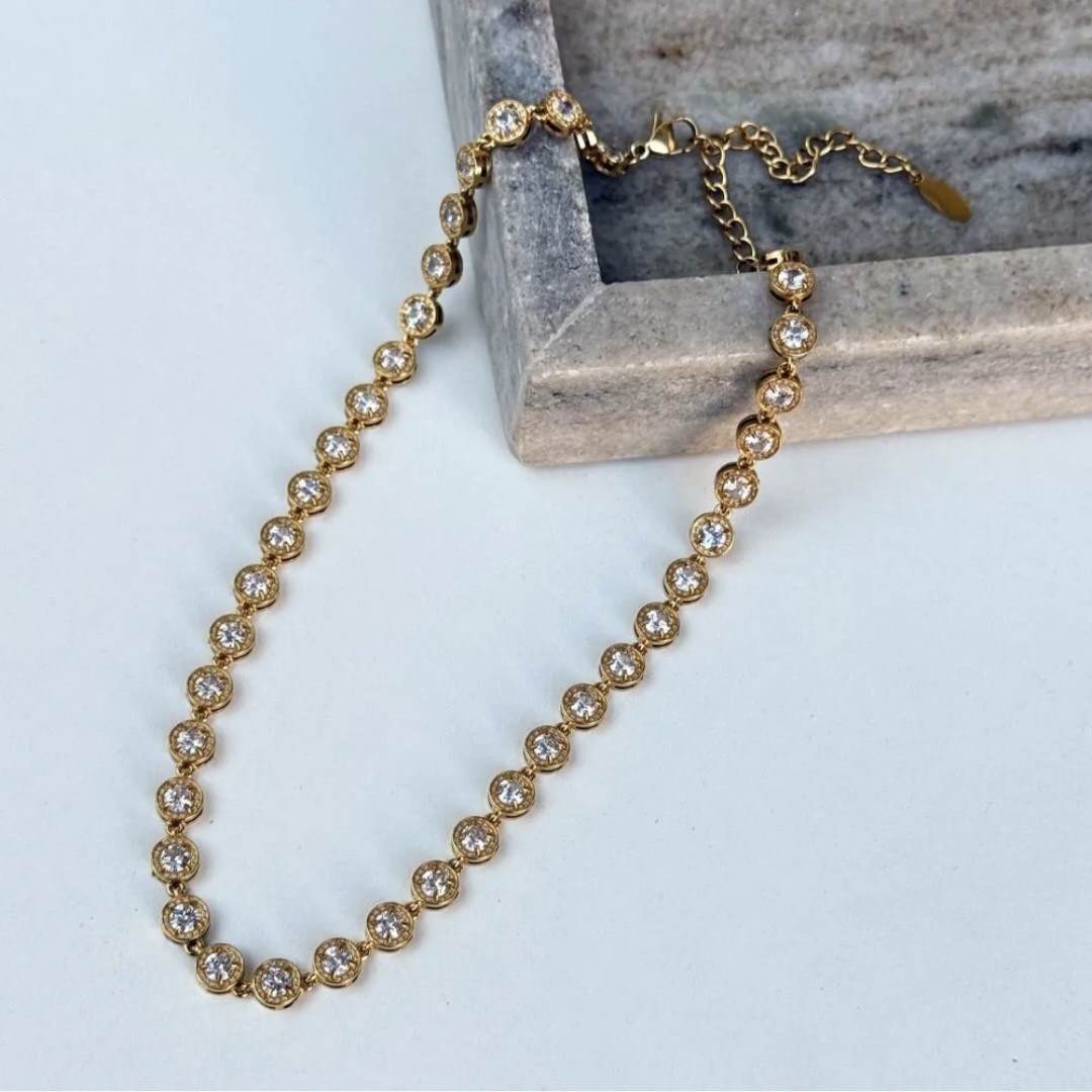 Το Strassea Gold Necklace είναι ένα εκλεπτυσμένο ατσάλινο χρυσό κολιέ με ζιργκόν σχεδιασμένο για γυναίκες που αγαπούν τη διακριτική λάμψη και την απλότητα.