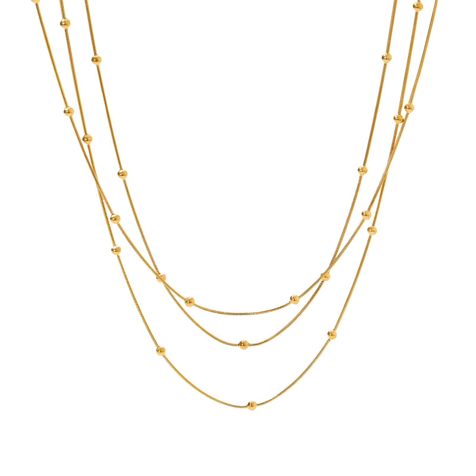 FIBRIS necklace, είναι ένα τριπλό κολιέ από επιχρυσωμένο 18Κ ατσάλι, με χρυσά στοιχεία να στολίζουν τις αλυσίδες.